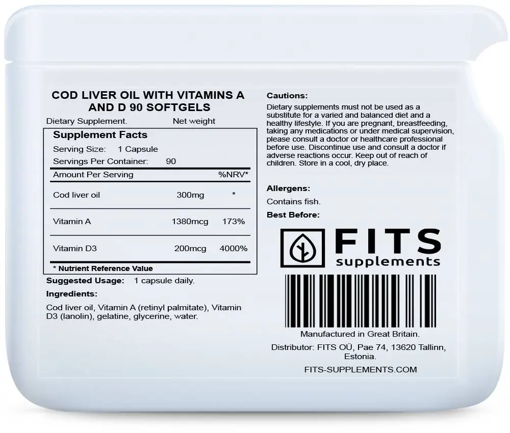 Ingredients: Cod liver oil, Vitamin A (retinyl palmitate), Vitamin D3 (lanolin), gelatin, glycerin, water.