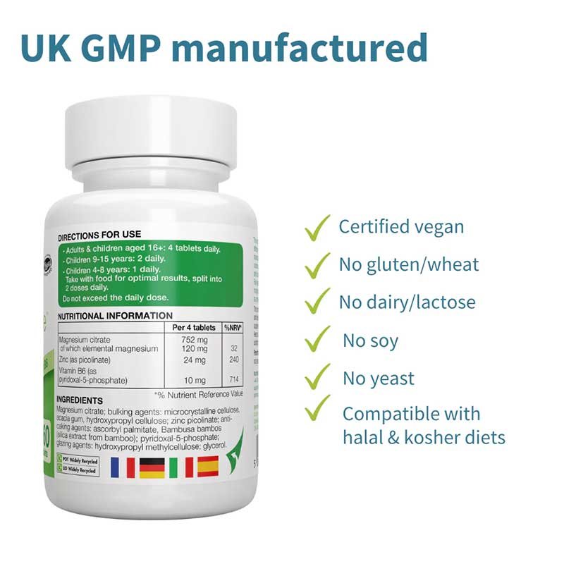 Ingredients: Magnesium citrate; bulking agents: microcrystalline cellulose, acacia gum, hydroxypropyl cellulose; zinc picolinate; anti-caking agents: ascorbyl palmitate, Bambusa bambos (silica extract from bamboo); pyridoxal-5-phosphate; glazing agents: hydroxypropyl methylcellulose; glycerol.