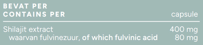 | ingredients | Shilajit 10:1 extract (20% fulvic acid), brown dextrin (carrier), HPMC vegetarian capsule (shell). |